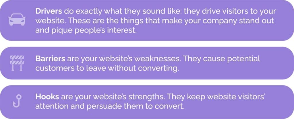 通过评估您网站的驱动因素、障碍和钩子,您可以进行调整以减少障碍并调整驱动因素和钩子,以确保您所承诺的(吸引潜在客户访问网站的驱动因素)就是您所兑现的(您的钩子——或您网站上的内容与最初将它们带到您的网站的内容相关联)。