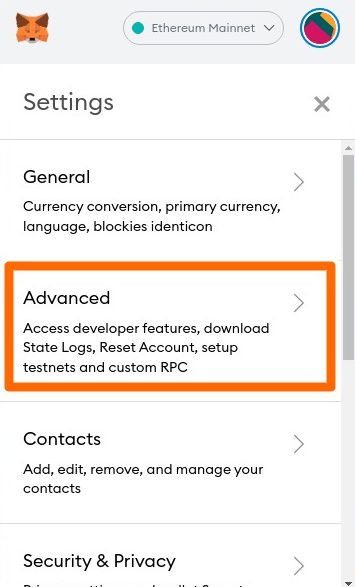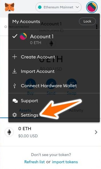 要获取 QR 码,请单击 MetaMask 扩展程序,然后单击您的头像。 接下来,从弹出窗口中选择设置选项。