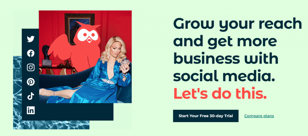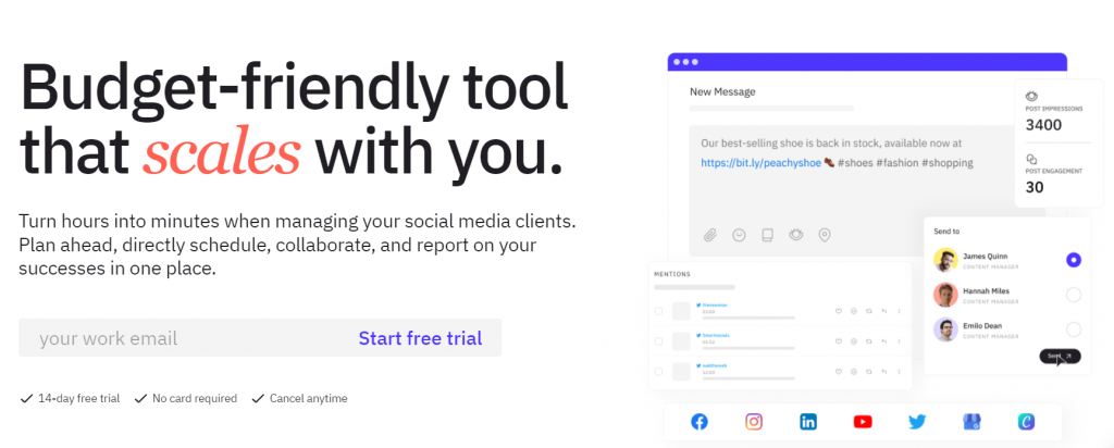 该管理工具支持团队协作、轻松登陆页面、分析、发布和参与。 它提供对免费计划的无限制访问。 付费计划有 14 天的免费试用期,每个社交媒体渠道每月 6 美元起。