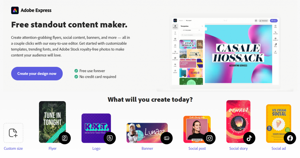 它为您提供 Adobe 字体、设计元素和模板、Adobe Stock 图像,无需版税(免费计划的有限访问)。 它允许您在社交媒体上计划、安排和发布内容(在免费计划中不可用); 在您的品牌中包含您的徽标、颜色和字体; 在包括 PDF 在内的多种文件类型之间进行转换和导出。