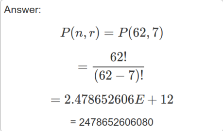 让我们做一些数学运算。 如果我们有 7 个地方,每个地方最多可以有 62 个可用字符,则可能的排列是: