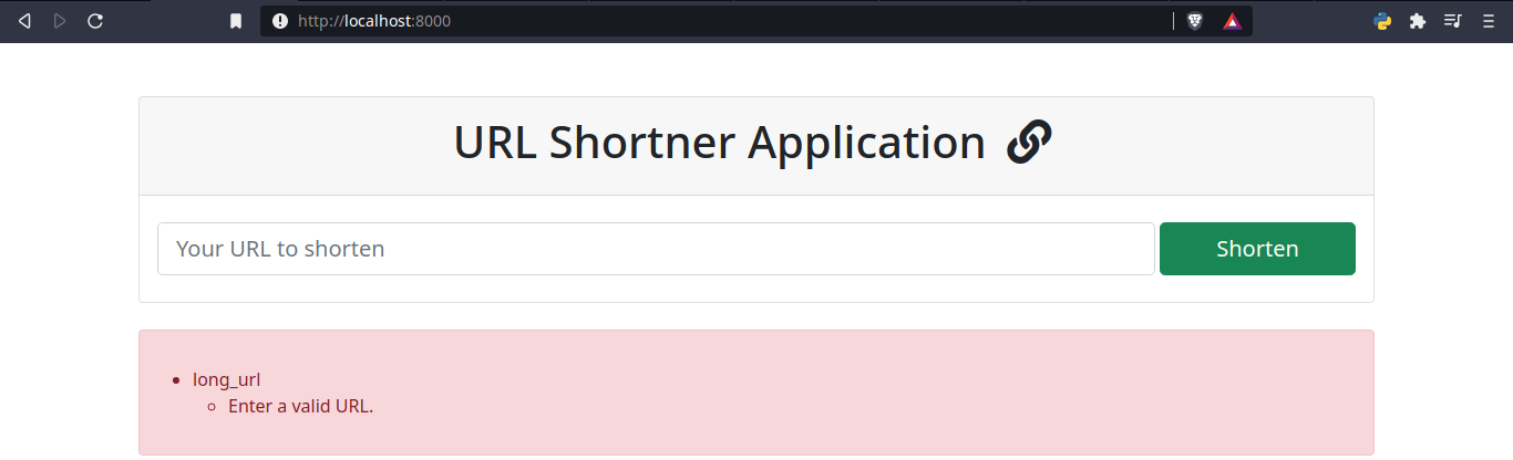 - 显示 Shortener 表单。 在里面,设置了 crsf 令牌(安全原因),并且只显示表单的长 URL 字段。 请记住,该字段具有 CSS 类“form-control form-control-lg”,因为我们在表单中设置了它。