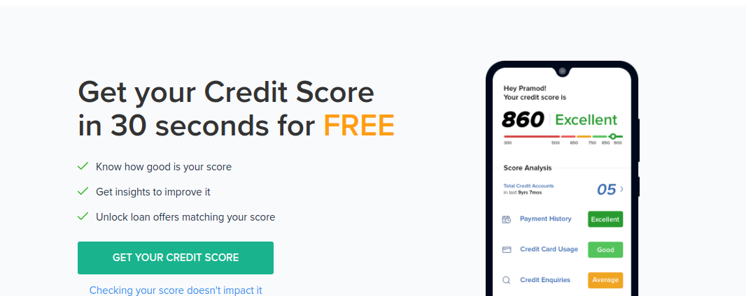 这是另一个免费工具,您可以用来免费检查您的信用评分。 您可以使用 Etmoney 了解您的分数有多好,获得见解,解锁与您的分数相匹配的贷款优惠,并在 30 秒内检查您的分数。 您需要做的就是将您的姓名添加到应用程序中,验证您的手机号码,然后您的报告就准备好了。