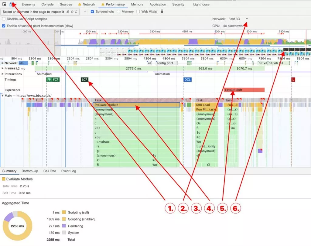 为了更详细地分析性能和 CWV 相关问题,我经常求助于 DevTools 中的 Chrome 性能监视器,我使用的一些关键 CWV 指标在下面的屏幕截图中编号。