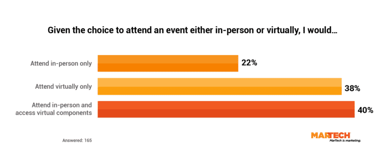 在大流行期间混合的优点是它让组织者有机会吸引更多的观众,包括现场和虚拟与会者。 我们调查的营销人员中约有 40% 表示他们会亲自参加活动并访问虚拟组件。 大约 22% 的人表示他们只会亲自参加,而 38% 的人表示他们只会参加虚拟组件。