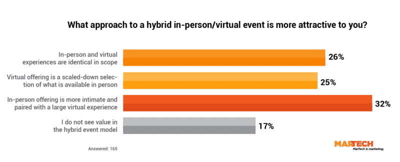 在我们调查的营销人员中,约有 32% 的人表示,他们更喜欢混合活动,其中面对面体验更小、更亲密,并与大型虚拟体验相结合。 另一方面,25% 的人表示他们更喜欢规模更大的面对面活动以及缩小的虚拟产品。