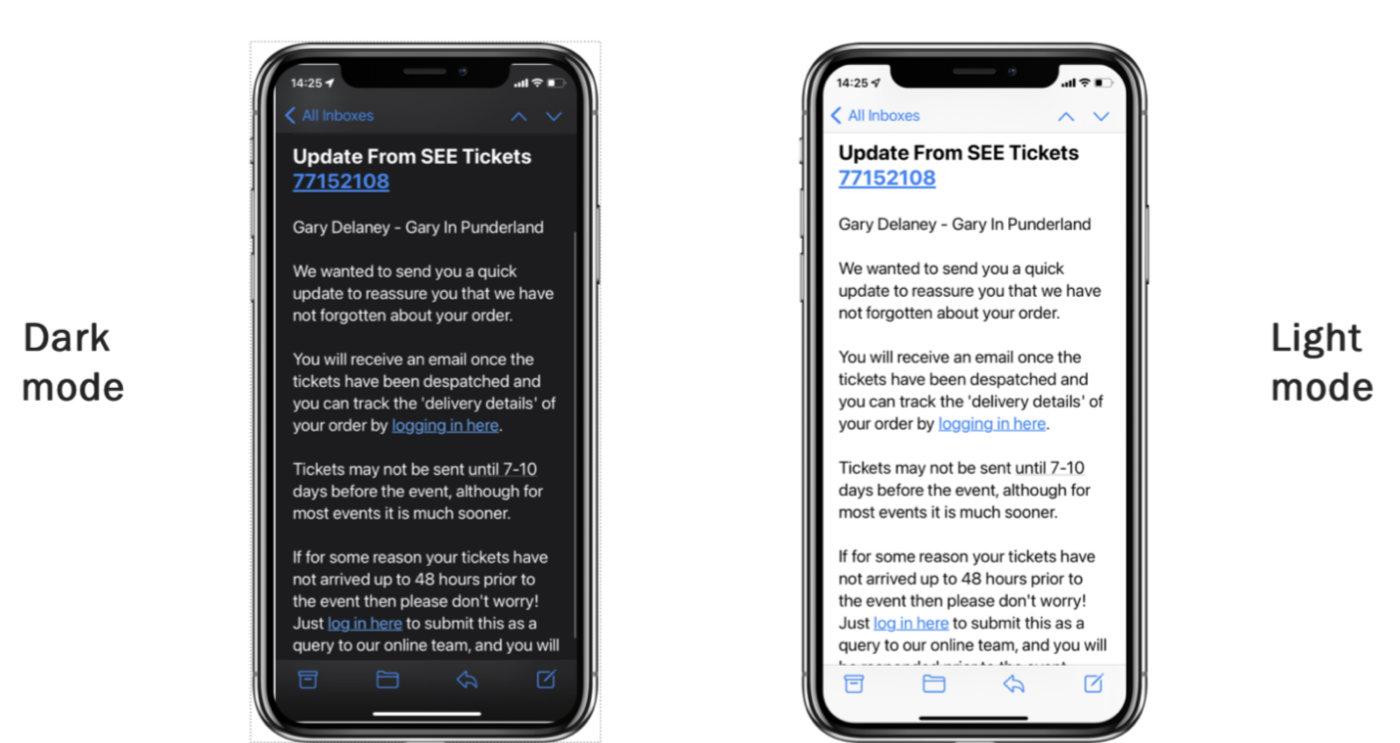 发件人可以使用媒体查询测试用户是否在其设备上启用了暗模式。 有了这些信息,发件人可以更改颜色和文本格式,并适当地显示或隐藏内容。