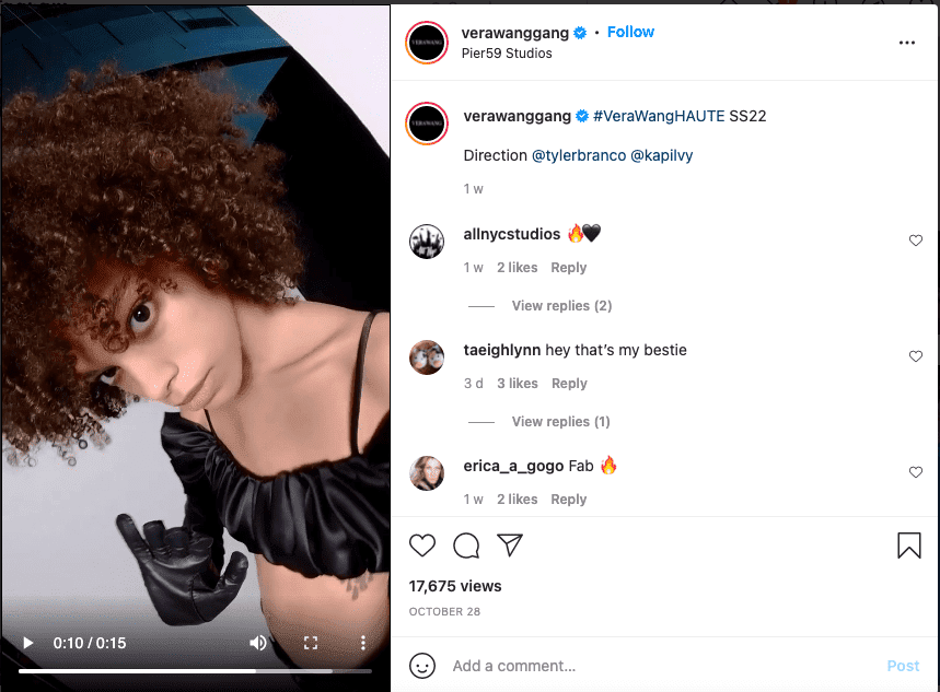 与影响者营销一样,用户生成的内容(或 UGC)为时尚品牌提供源源不断的内容,并允许用户与更广泛的时尚社区互动。 UGC 是源自用户的任何内容。 在 Instagram 上,这通常是视频评论、教程、视频博客或品牌产品或服务的照片等内容。