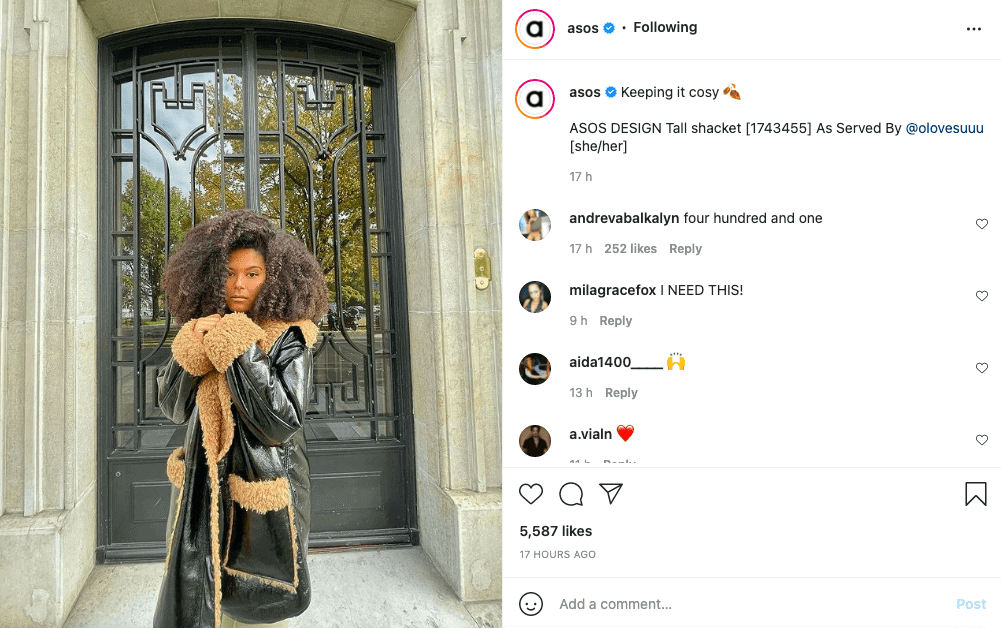 另一方面,像 ASOS 这样的品牌产品种类繁多,以至于很难让他们的 Instagram 商店保持井井有条。 相反,他们在每个提要帖子的标题中添加产品代码,如下例所示。