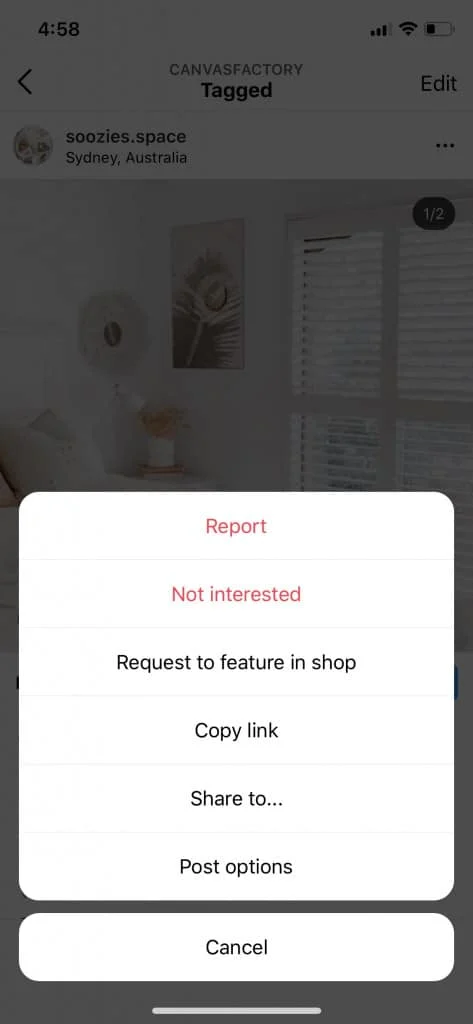要在您的购物标签中标记用户生成的内容,只需找到已标记您的品牌的帖子。 点击帖子右上角的三个点,然后点击“请求加入商店”。 然后将通知影响者或内容创建者您的请求。 如果获得批准,当用户在您的 Instagram 商店点击该产品时,该图像将显示。