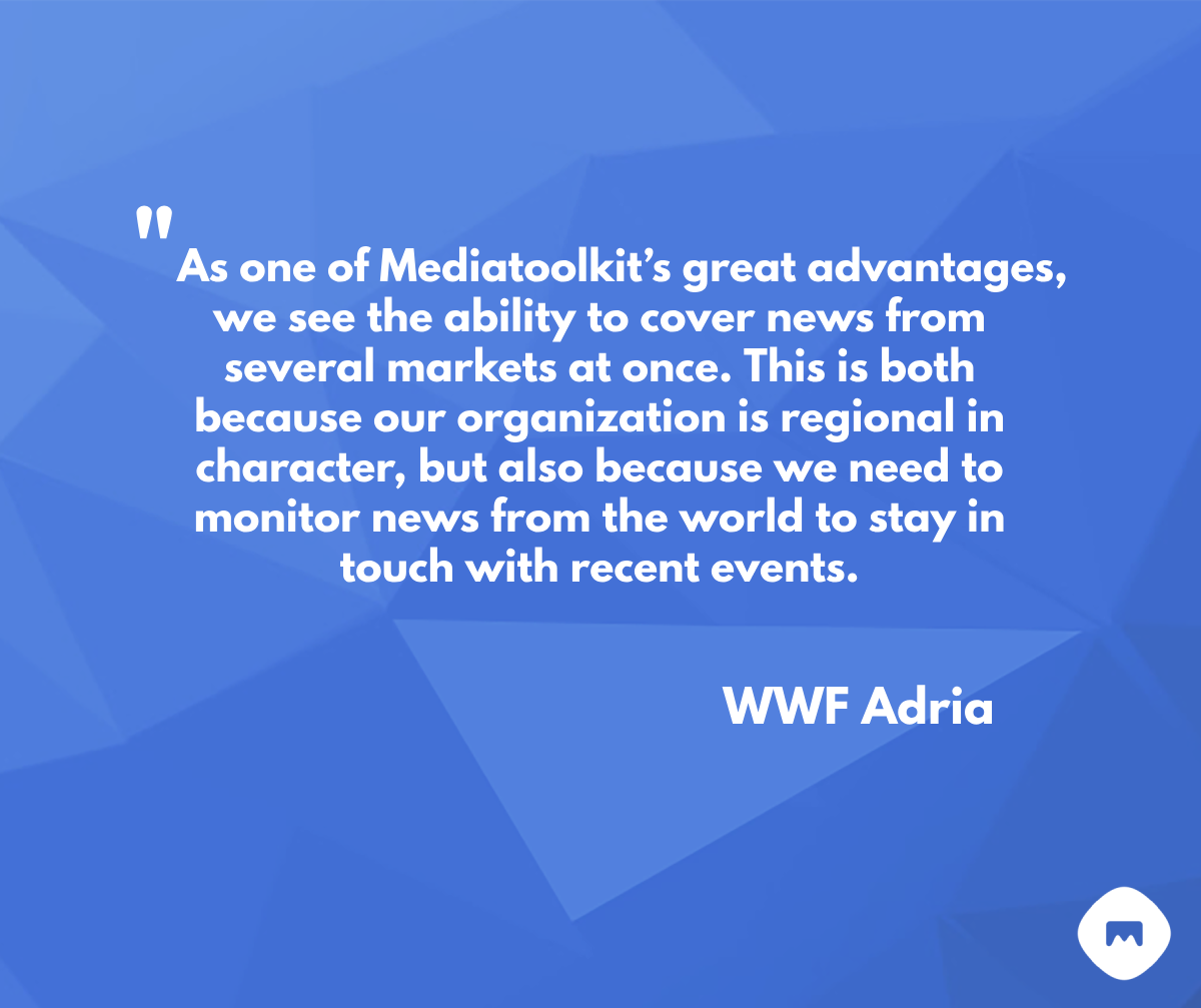 地理测绘对于在多个不同国家开展业务的区域性非政府组织尤为重要。 这样,非政府组织可以同时报道来自多个市场的新闻,并与每个特定国家/地区的最新事件保持联系。 出于这个原因使用 Mediatoolkit 的一个这样的组织是 WWF Adria ,它在超过 12 个国家/地区就政策问题和沟通进行合作和领导项目。