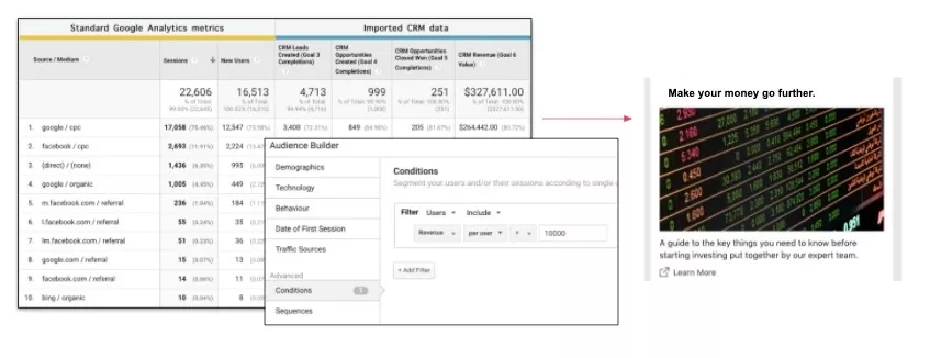 在这种情况下,我们可以设置条件以仅过滤掉投资超过一定金额的用户,然后使用该列表通过 Google 展示广告网络扩展和定位类似的受众群体(您定义的受众群体的相似对象)。
