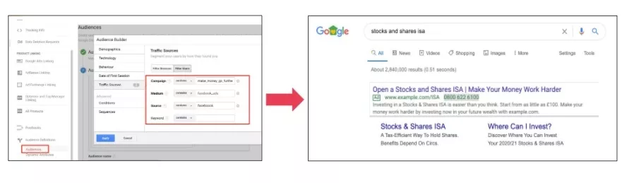 这使我们能够对更通用的条款进行出价,而不会将大量预算投入到更广泛的受众群体中。 在这个例子中,我们能够根据之前点击我们 Facebook 广告或我们的 Quora 广告的用户通过 Google Analytics 建立受众,这些广告按这些广告系列中使用的 UTM 标签进行细分,然后再针对这些用户正在 Google 上搜索。