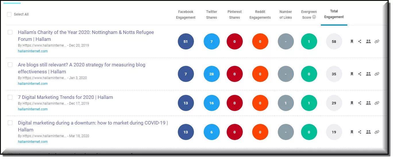 在此示例中,您可以看到 Hallam 站点上共享最多的内容是什么: