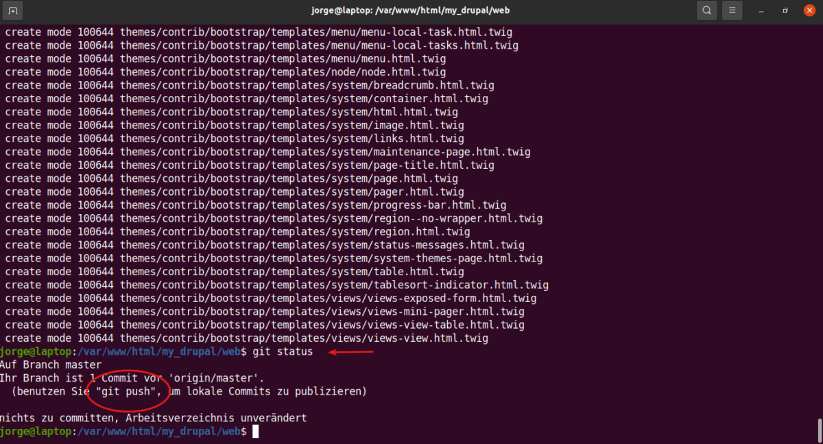 cd /var/www/html/my_drupal/web mv example.gitignore .gitignore git init git add . git commit -m 'Fresh Drupal installation'您正在访问 Drupal 安装的根目录,将文件 example.gitignore 的名称更改为 .gitignore,初始化本地存储库,将文件添加到 git 暂存区,最后提交这些“更改”(repo 最初是空)到存储库。