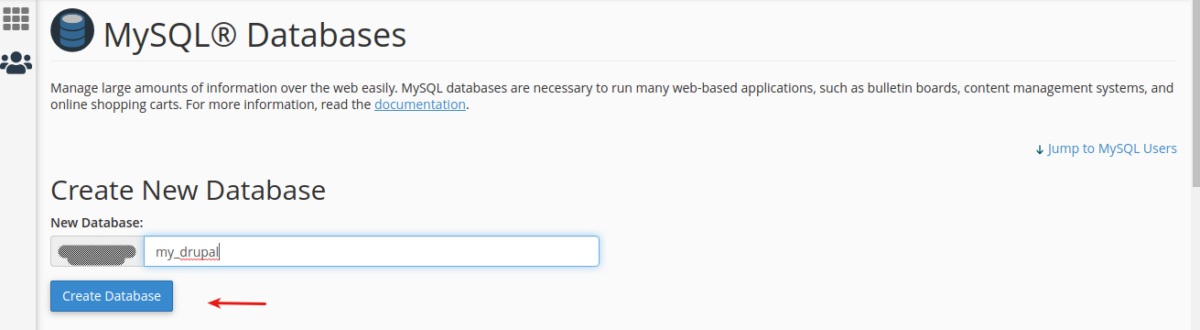请注意 cPanel 自动添加的数据库前缀(在大多数情况下是您的用户名)。