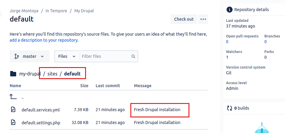 检查 Bitbucket 上的存储库。 Web 目录(您的本地存储库)中的几乎所有文件都已复制到您的远程存储库。 查看站点/默认目录。