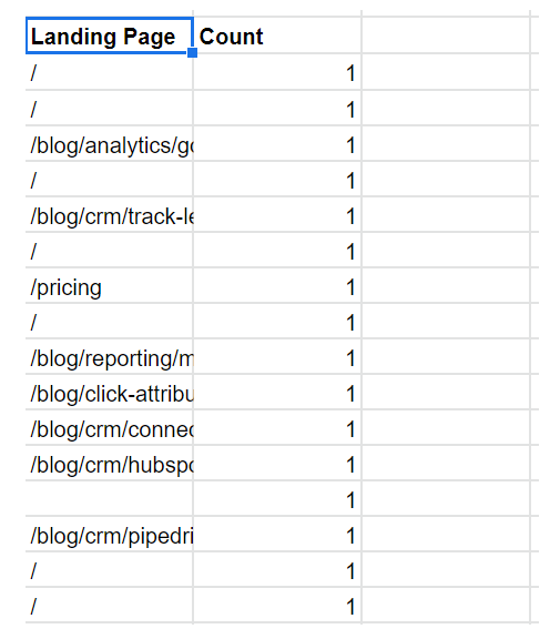 将首次点击来源和登录页面的完整列表复制并粘贴到另一张工作表中。 对于每个,在每行旁边添加一个计数。