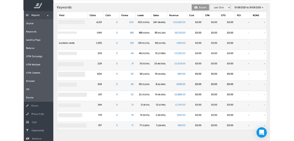 Ruler 还提供大量其他报告,您可以在其中按点击次数、潜在客户和销售额细分业绩。