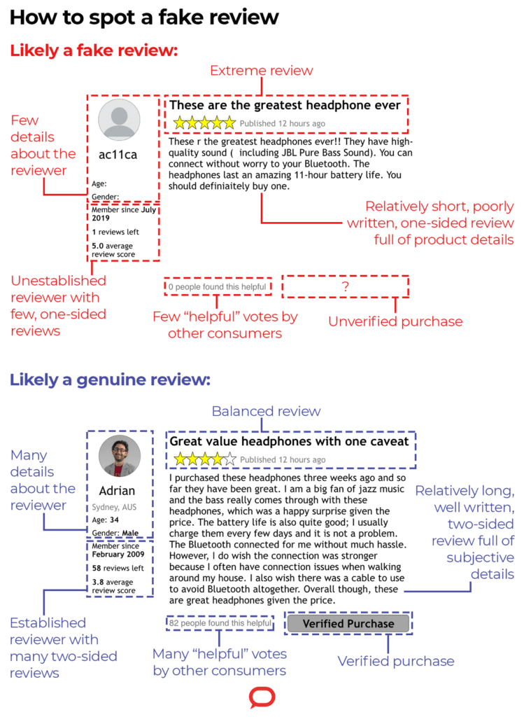 对话创建了一个有用的插图,向您展示了虚假评论和真实评论之间的区别。