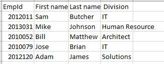 EmpId,First name,Last name, Division 2012011,Sam,Butcher,IT 2013031,Mike,Johnson,Human Resource 2010052,Bill,Matthew,Architect 2010079,Jose,Brian,IT 2012120,Adam,James,Solutions如果我们在 Excel 中查看,可以看到如下所示的行列结构: