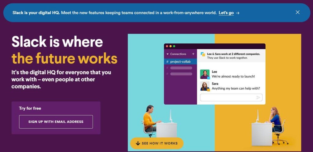 像Slack这样的平台可用于您的所有团队沟通。 Slack 具有消息、语音和视频通话功能,几乎可以满足您的所有通信需求。 您还可以为不同的项目、主题或团队创建频道,只有需要参与对话的团队成员。