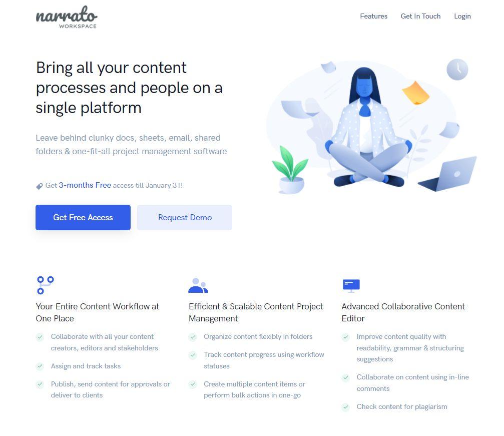 Narrato是一个内容创建、协作和工作流管理平台,可将您的完整内容流程集中到一个地方。 您可以将整个团队带到平台上,就内容项目进行协作。 可以轻松地将任务分配给内容创建者,并且可以使用平台上的在线评论和消息共享反馈。 功能强大的内容编辑器,带有内容优化建议、AI 写作助手和抄袭检查,帮助作家创作高质量的内容。 通过为不同的内容项目创建自定义模板和样式指南,也很容易向作者介绍情况。