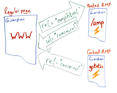尽管上图中的页面有 2 个 AMP 版本的引用,但卫报只需要在其网站上创建和托管每篇文章的一个 AMP 版本。 Google、Twitter、Pinterest 和 Linkedin 等公司随后可以托管由 Guardian 等出版商创建的 AMP 内容的缓存版本,这意味着用户无需实际访问 Guardian 网站即可阅读文章。