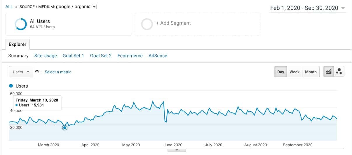 您可能在上面的屏幕截图中注意到 9 月初的另一次流量下降。 在 Google Analytics(分析)屏幕截图中,它比Search Console 更明显。