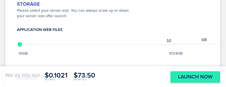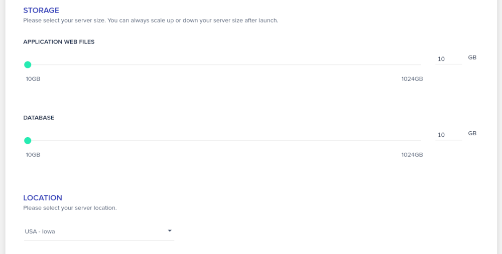 其他选项包括服务器位置、带宽、应用程序存储和数据库存储大小。