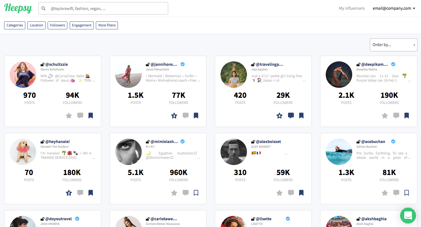 您可以使用類別,區域,參與度等過濾條件來選擇最適合您品牌的影響者。 為了加快您的流程,Heepsy還會估算影響者的每條帖子費用。