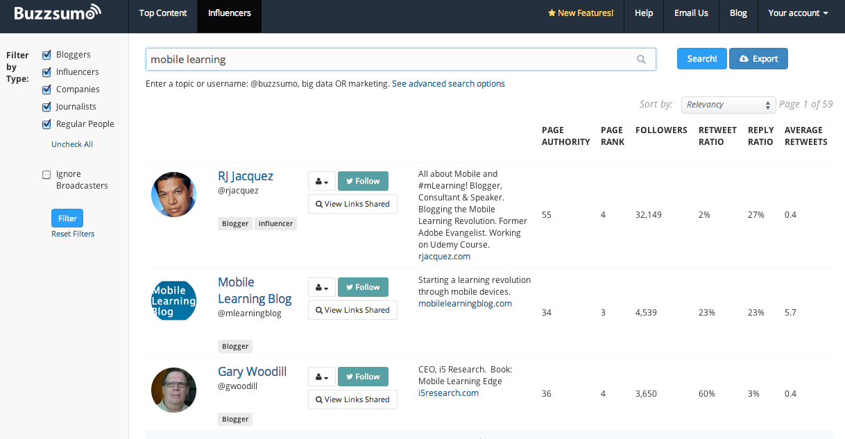 此時,BuzzStream是一個建立關係的平台,它內置了一個有影響力的搜索工具。 該工具會根據與您的關鍵字相關的在線內容來查找影響者。 您可以大致了解他們的社交資料和聯繫信息,從而可以設置後續的推廣活動。