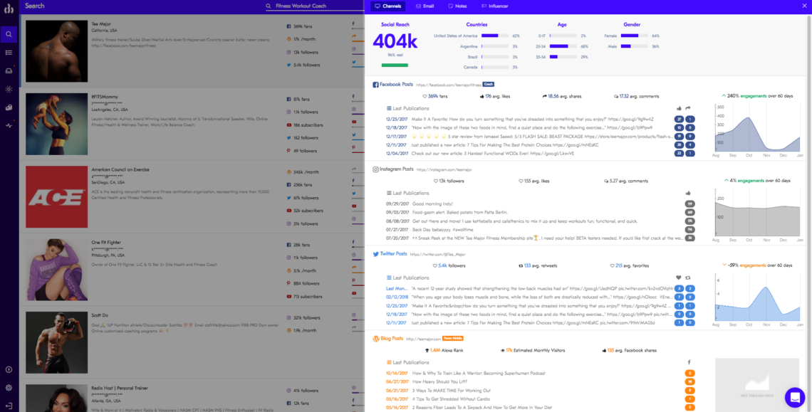 HypeAuditor會根據覆蓋面,受眾特徵,受眾語言,位置,年齡,性別和參與度,找到最適合您品牌的影響者。 與許多其他工具一樣,HypeAuditor密切注意確定影響者是否真實。