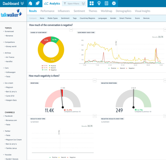 Talkwalker是用於情感分析的另一個出色工具。 該工具聲稱擁有最佳的情感分析技術,該技術使其能夠檢測出諷刺和其他明顯的否定形式。 它還監視行業和客戶滿意度趨勢,後者使您能夠更輕鬆地發現喜歡您產品的哪些功能(不喜歡)。