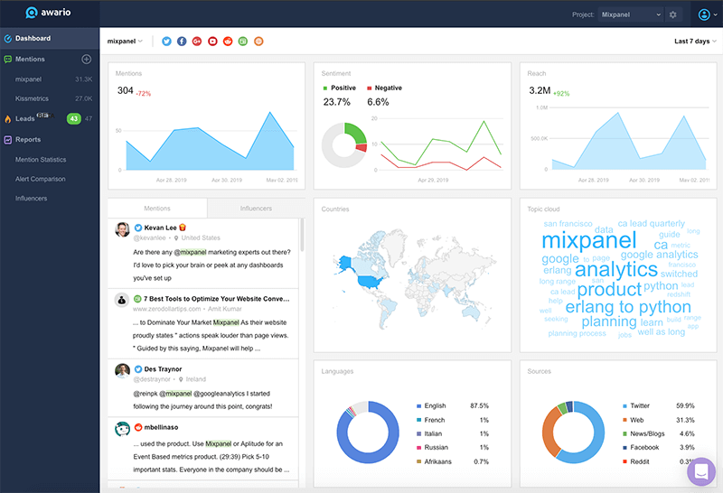 Awario是社交媒體監視和分析工具。 它涵蓋了所有主要的社交媒體網絡,新聞,博客,論壇和網絡。 內置的情緒分析功能(在所有計劃中均可用)將品牌提及分為正面,負面和中性。 您會得到一張圖表,顯示您的提及隨著時間的推移如何增長,以及總體情緒如何變化。 除了品牌的人氣外,您還可以看到當人們談論您的公司時最常提及的主題。