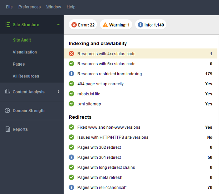 WebSite Auditor是檢測盲點的好工具,該盲點可能導致搜索結果性能不佳。 WebSite Auditor的免費版本可讓您分析多達500個URL,並在此過程中計算總體網站統計信息。