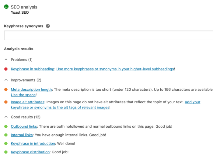 Yoast SEO是WordPress網站的首選選項-只需安裝插件並掃描您的內容,以了解關鍵字密度和頁面上的最佳位置。 Yoast還將重點介紹重複的內容問題和可讀性問題,幫助您朝著完美優化的內容邁進。