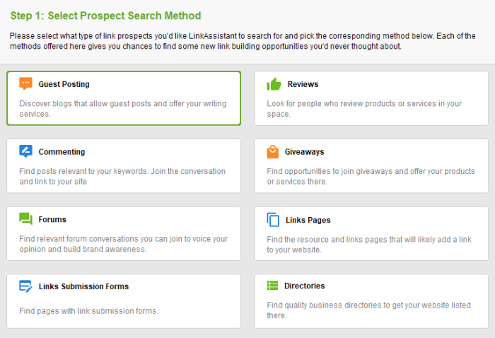 諸如LinkAssistant之類的工具可立即提供數百個反向鏈接機會-您只需選擇潛在客戶搜索方法(或自行設置),輸入關鍵字,指定搜索引擎,然後獲取潛在鏈接夥伴的聯繫方式即可。