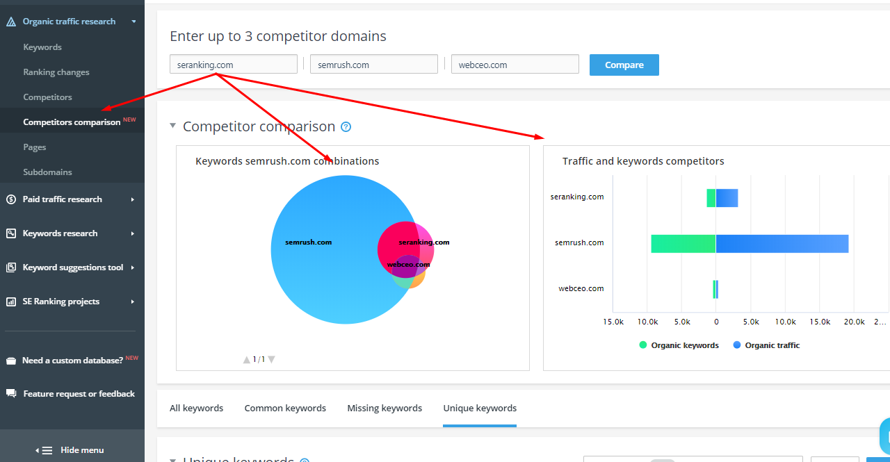 您可以通過SE排名的PPC競爭對手研究模塊中的語義比較表等工具,查看競爭對手如何為您的品牌關鍵字投放PPC廣告。 如果您根據兩個主要競爭對手來分析您的網站,您將獲得大量關於品牌關鍵詞如何相互競爭以及哪種關鍵詞對他們最有效的想法。