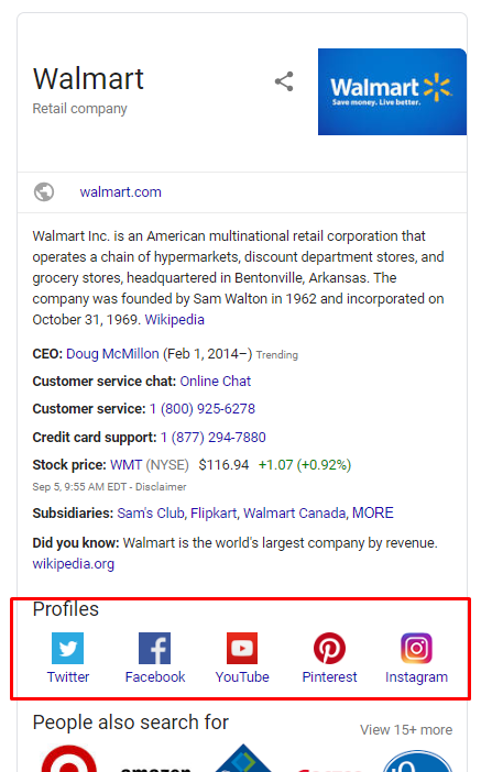 Google現在還為品牌提供了更多機會,使品牌的社交媒體資料出現在Google Knowledge Graph Box中。 這可以使您提高在線可見度,並在一處顯示有關您的業務的更多有價值的信息。