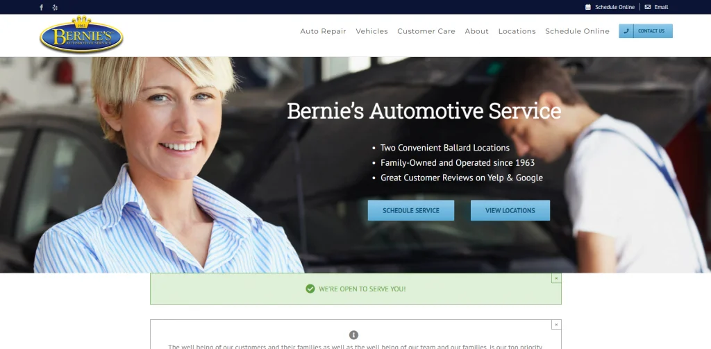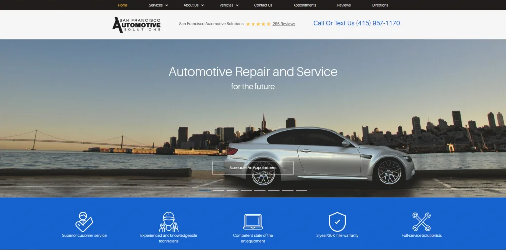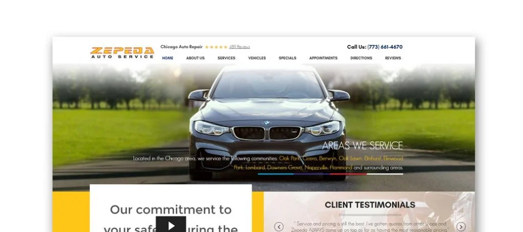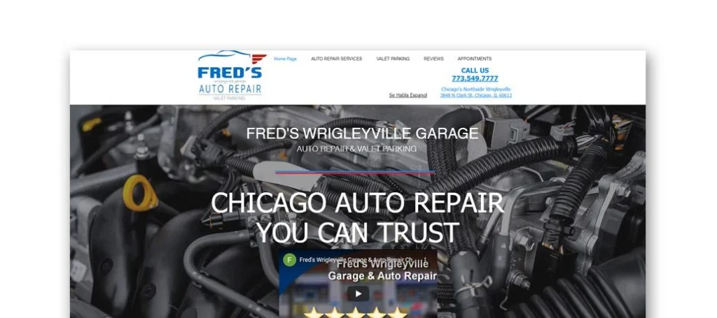 這個汽車維修網站在頁面頂部展示了他們的營業時間和他們提供的服務。 還有一個視頻,可以讓人們更好地了解業務。 尤其是那些從視覺中學習得更好的人。 主頁上突出的一些功能是實時聊天、滿意的客戶推薦和 Google 地圖。