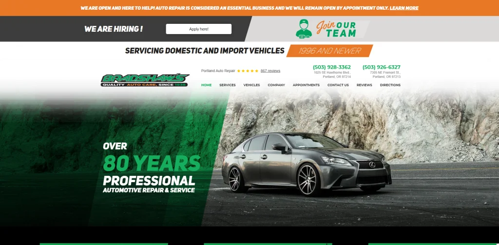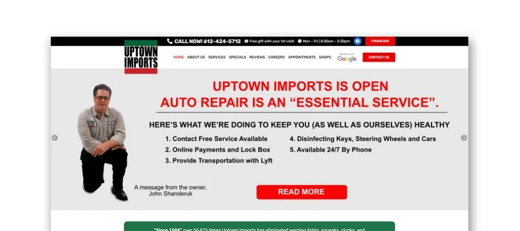 這個汽車維修網站非常有條理,易於瀏覽信息。 介紹標題中的第一件事是他們的電話號碼和請求約會的方式。 他們想讓人們盡可能輕鬆地與他們聯繫。 這家汽車店做很多輪胎銷售,網站強調輪胎銷售。 所有信息都清晰易讀,他們做得很好,詳細解釋瞭如何在下班後還車。