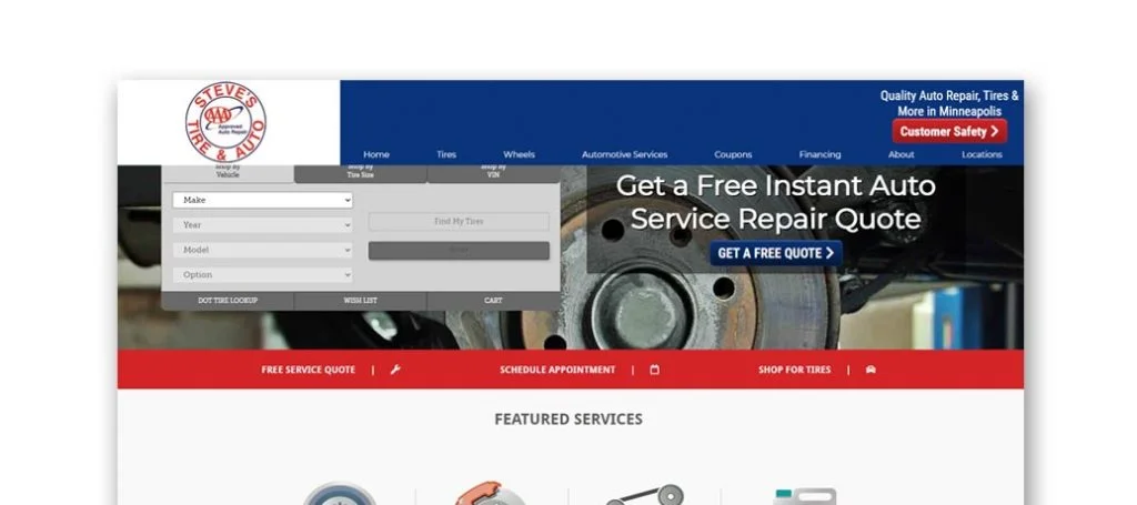這個汽車維修網站很簡單,主頁上有圖標顯示特色服務。 就在英雄標題處,有一個表格,您可以填寫表格以查找您的汽車所需的輪胎。 通過頁面頂部和底部的鏈接,該站點易於導航和發現信息。