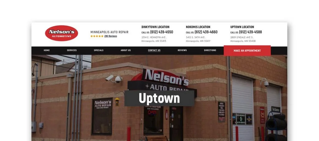 Nelson's Automotive 非常簡潔明了。 有一種流行的紅色真的讓一切都融合在一起。 紅色的使用是為了突出並引起對網站上重要信息的關注。 他們明確表示他們有多個位置,並在主頁頂部分享不同的位置。 幫助潛在客戶找到離他們最近的位置。