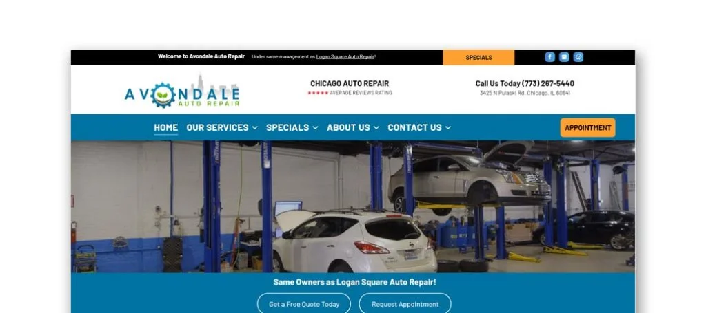 Avondale Auto Repair 網站專注於推動汽車商店的業務發展。 他們為新客戶提供特別優惠,讓您很容易獲得報價和預約。 每個頁面上都可以看到預約按鈕和電話號碼。 此外,這是一個很好的汽車維修網站的一個很好的例子,因為網站的流動性好,以及設計如何保持觀眾的注意力。