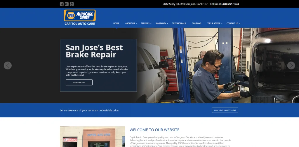 這個汽車維修網站很乾淨,專注於他們的電話號碼、時間和位置等細節。 許多強大的號召性用語可以讓讀者發現新信息,例如“閱讀更多”和“致電我們”。 在這些鏈接中,有更多關於業務、服務和推薦的信息。 通過每個頁面頂部和底部可見的鏈接,可以輕鬆瀏覽信息。
