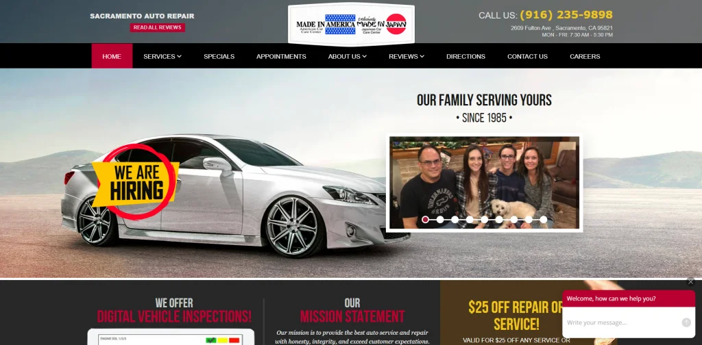 Sacramento Auto Repair 的網站很簡單。 紅色配色方案有助於突出重要信息。 紅色確實與他們使用的較暗背景顏色形成鮮明對比。 仍然使用了大量的白色,這很好,因為它使頁面更簡單,並且不會讓頁面變得不堪重負。 主頁上的一些功能是客戶推薦、聯繫表格和實時聊天,這些功能有助於網站脫穎而出。