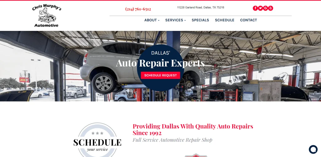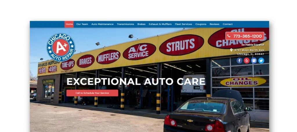 這個汽車維修網站有一個鮮紅色的配色方案。 顏色將您的注意力吸引到他們的電話號碼和其他重要信息上,例如提供的服務、有關他們的信息和評論。 Midtown 分享來自 Yelp 和 Google 的評論。 這是向潛在客戶展示許多其他人對您的工作感到滿意並且他們可以期待同樣的好方法。