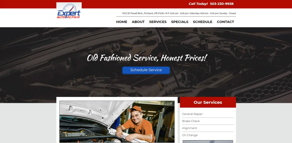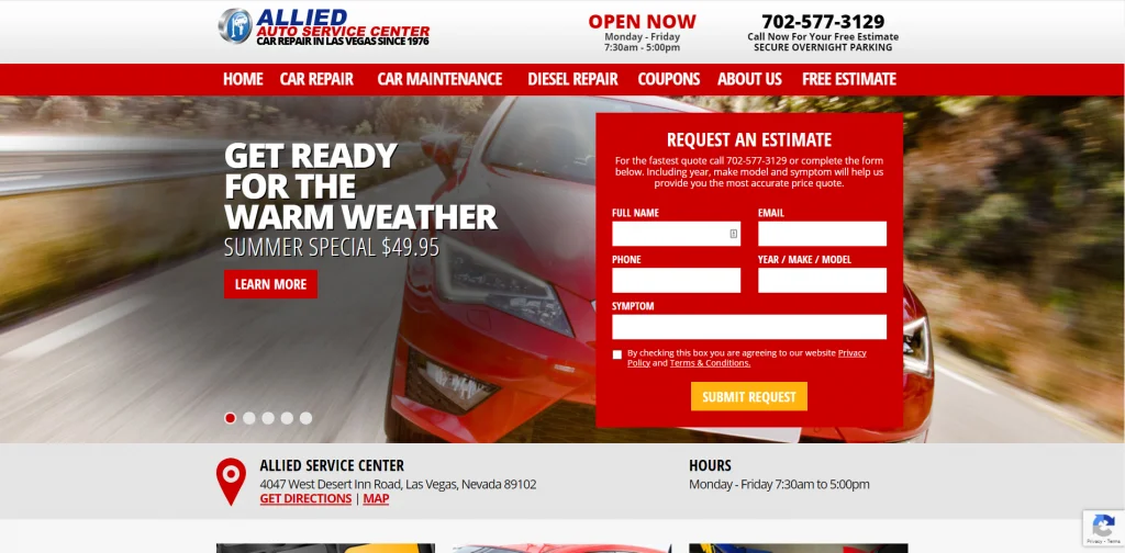 該網站專注於建立聯繫人列表,當您註冊短信提醒時,為您的下一項服務提供 10 美元的折扣。 主頁上突出顯示了商店的保修、班車服務和優惠券。 這是吸引讀者註意力並讓他們來到您的商店的好方法。 電話號碼與安排約會的按鈕一起顯示在頁面頂部。