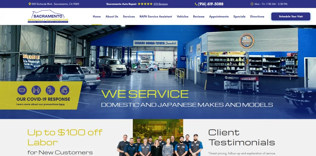 Sacramento Auto Repair 的網站非常乾淨且有吸引力。 有黃色和紫色的配色方案。 這在整個網站上運行良好。 該網站對吸引觀眾注意力的圖片採用了完美的設計。 通過整個網站的幾個不同鏈接進行預約非常簡單和容易。 此外,頁面底部還有社交媒體鏈接,希望以不同的方式與訪問者建立聯繫。